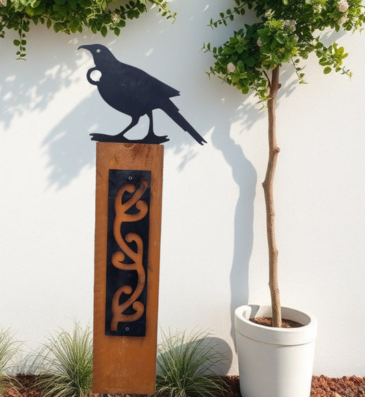 Corten Pīwakawaka Garden Art on Black Stained Post - Unique NZ Fantail Garden Decor