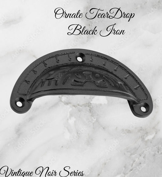 Rustic Black Iron Teardrop Victoria's Ornate Cup Drawer pull 100mm long