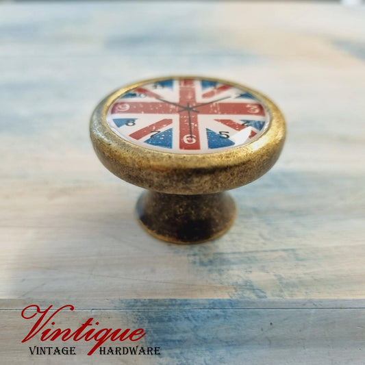 CLEARENCE PRICE-Vintage Union Jack Clock Furniture Glass/Alloy Knob 35mm
