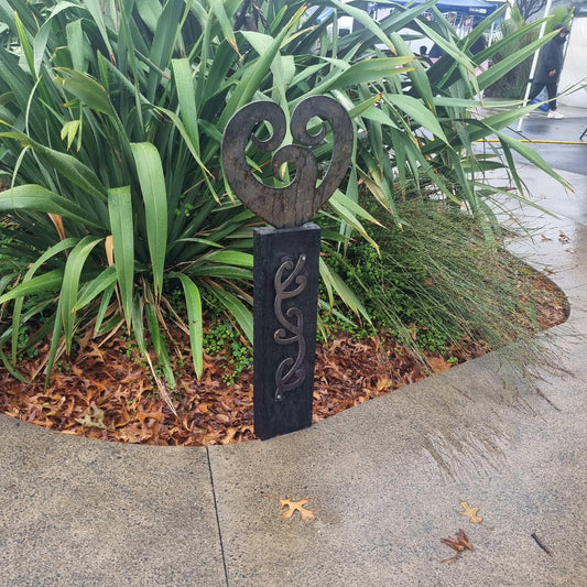 Black metal NZ Koru Heart on Rustic Oak Post-Garden Art