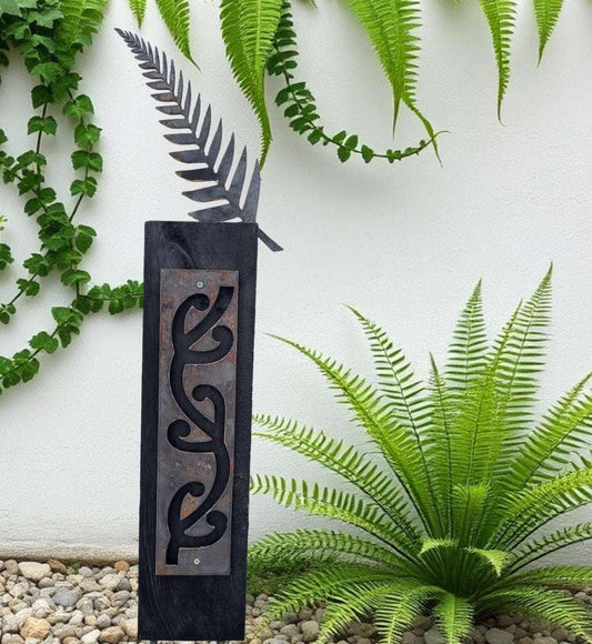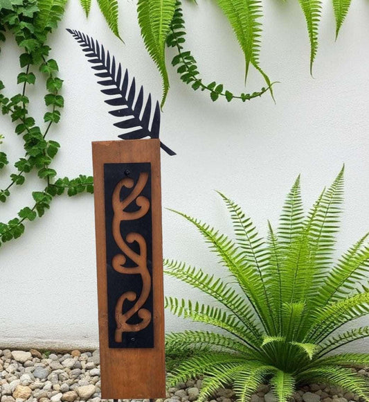 Corten NZ Huruwhenua (Silver fern) on Black stained Post-Garden Art