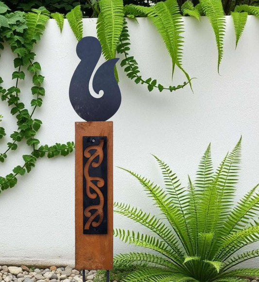 Corten NZ Hei Matau (Hook) on Black stained Post- Garden Art