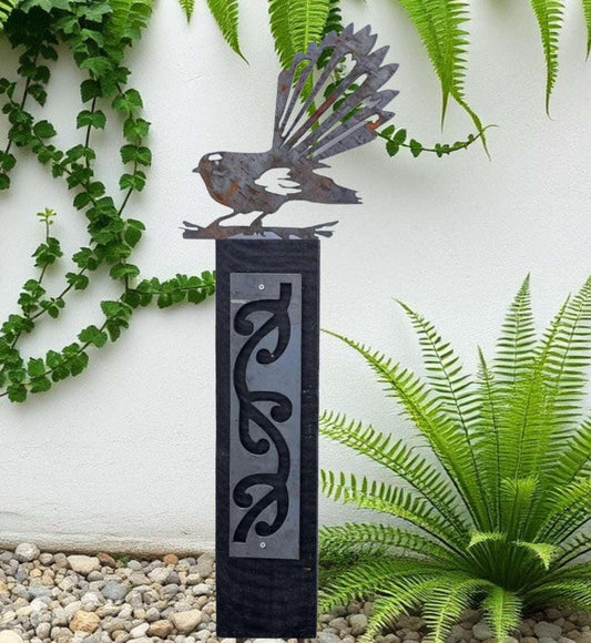 Black Metal Pīwakawaka NZ Fantail Rustic Oak Post garden art