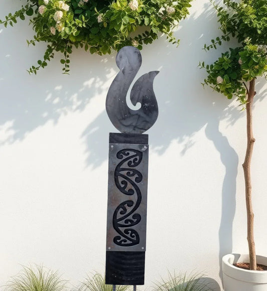 Black metal NZ Hei Matau (Fish Hook) on Rustic Oak Post-Garden Art