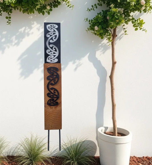 Black Metal Garden Art - Long Koru Pattern on Rustic Oak Post