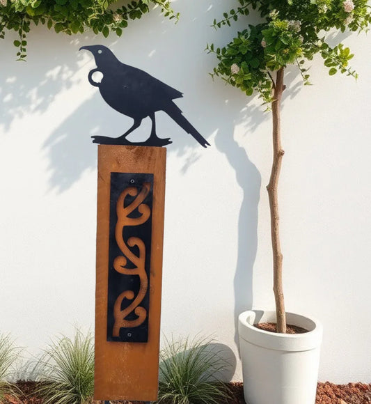 Corten Tui (NZ Song Bird) on Black stained Post-Garden Art
