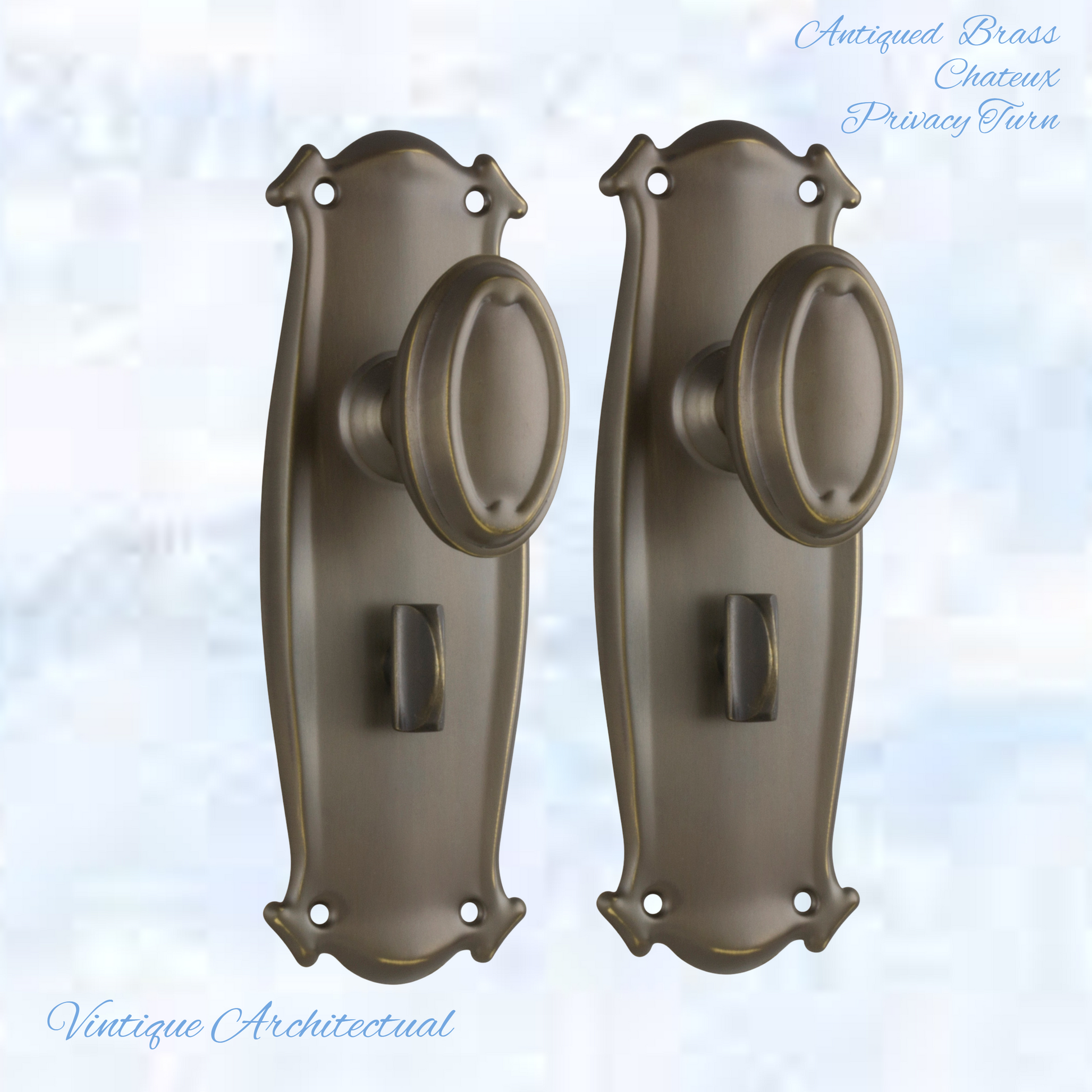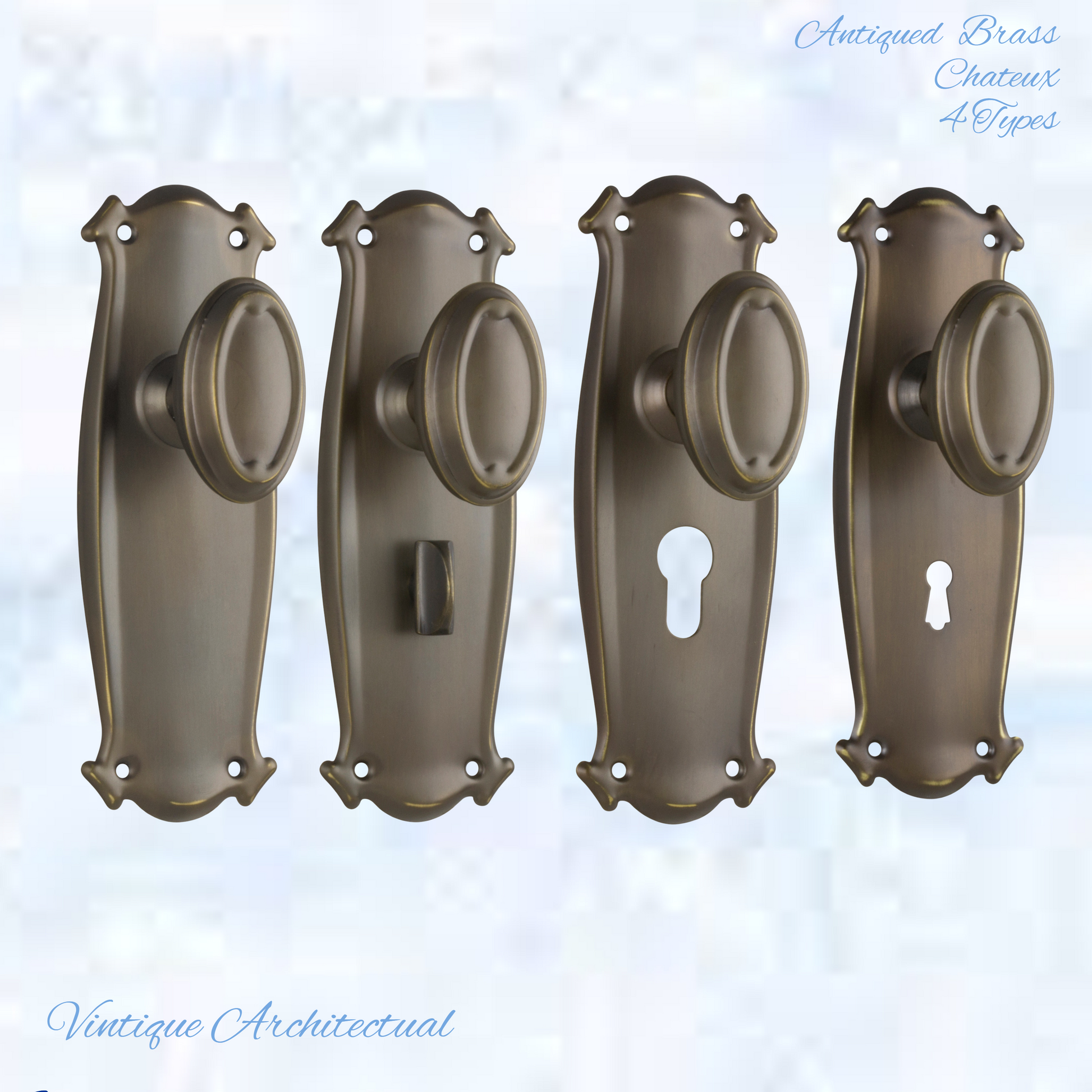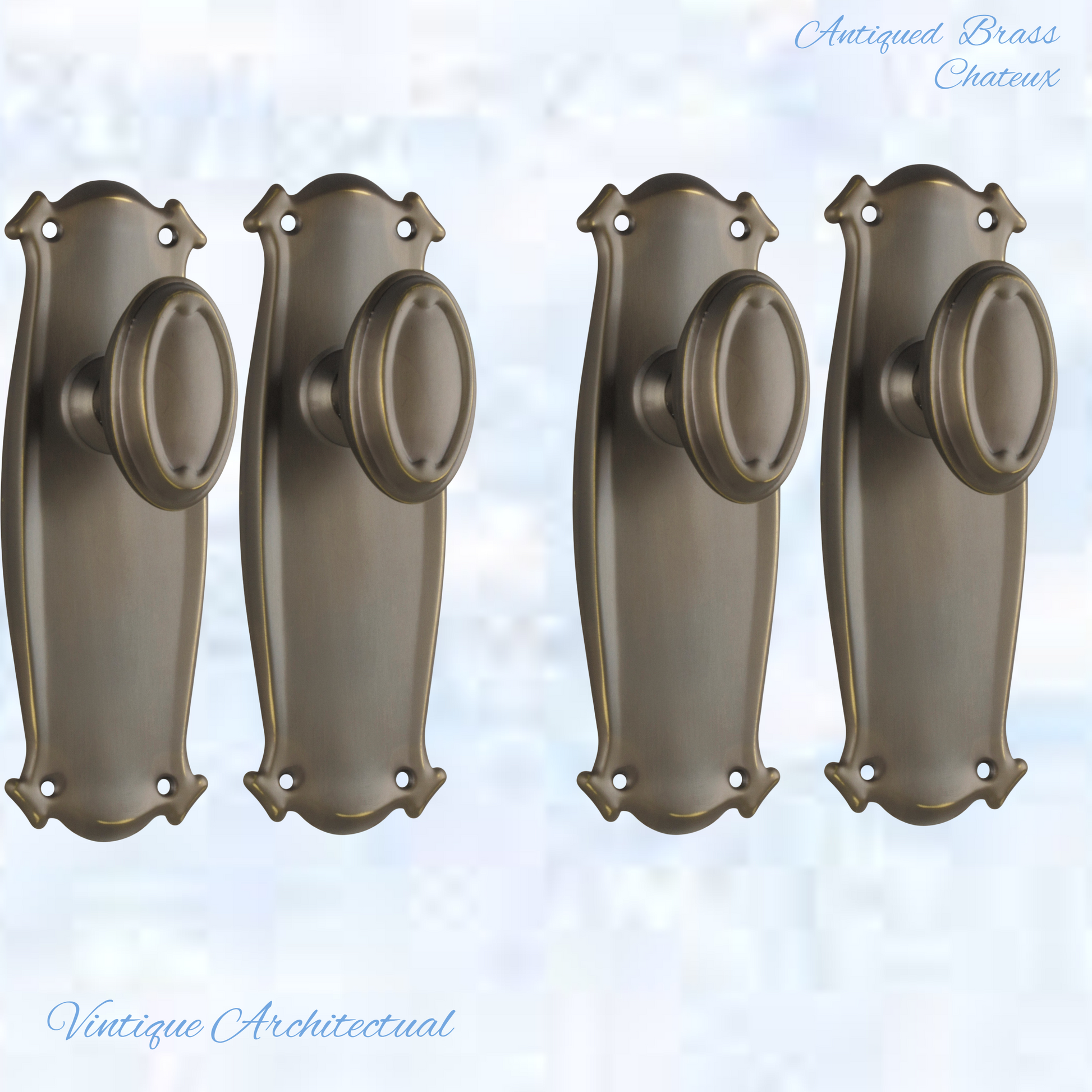Vintique's Firenze Antiqued Brass Chateau Oval door Vintage door knob handles with a fixed backplate add a touch of Class to your home. Not only functional, strong with heavy-duty beauty for your doors.