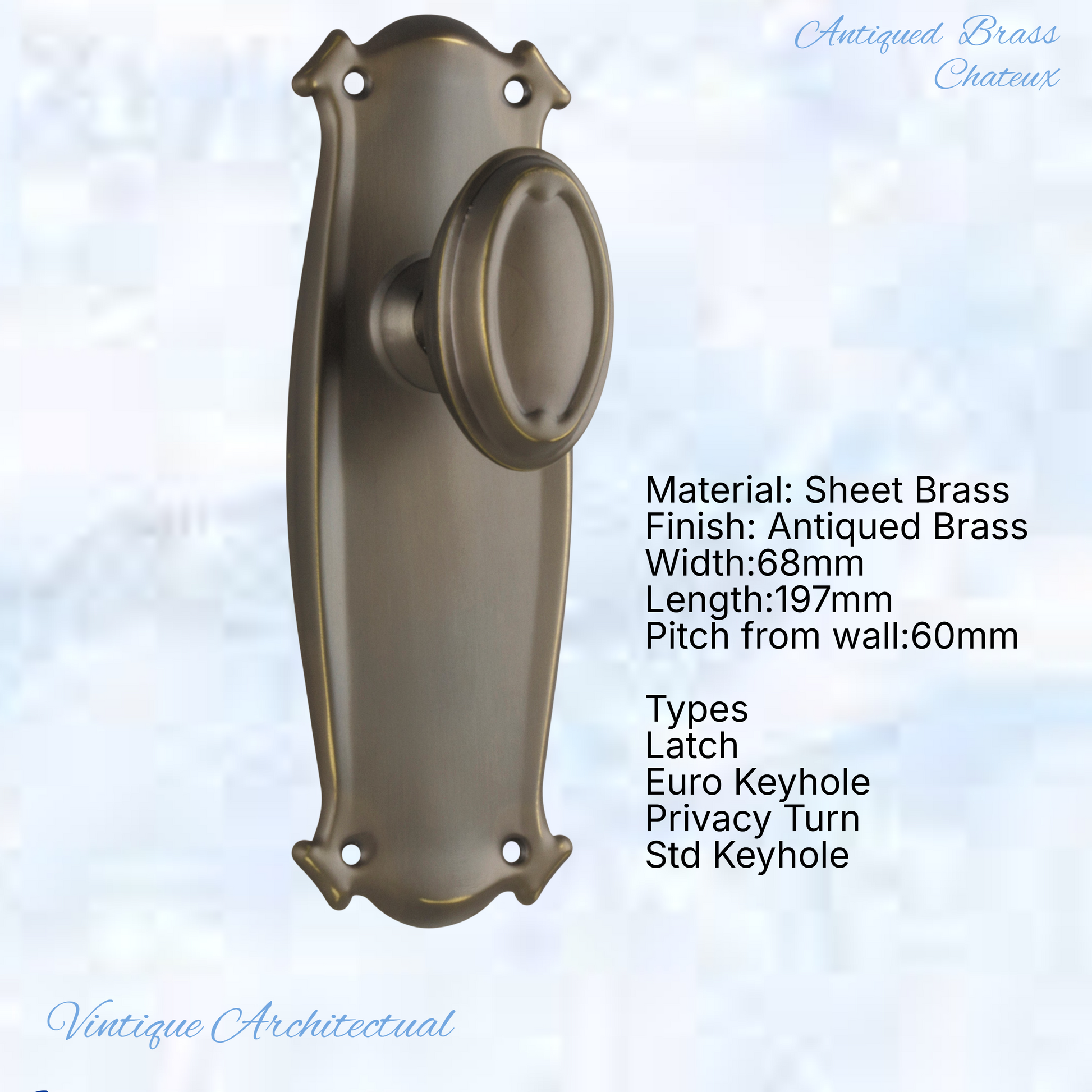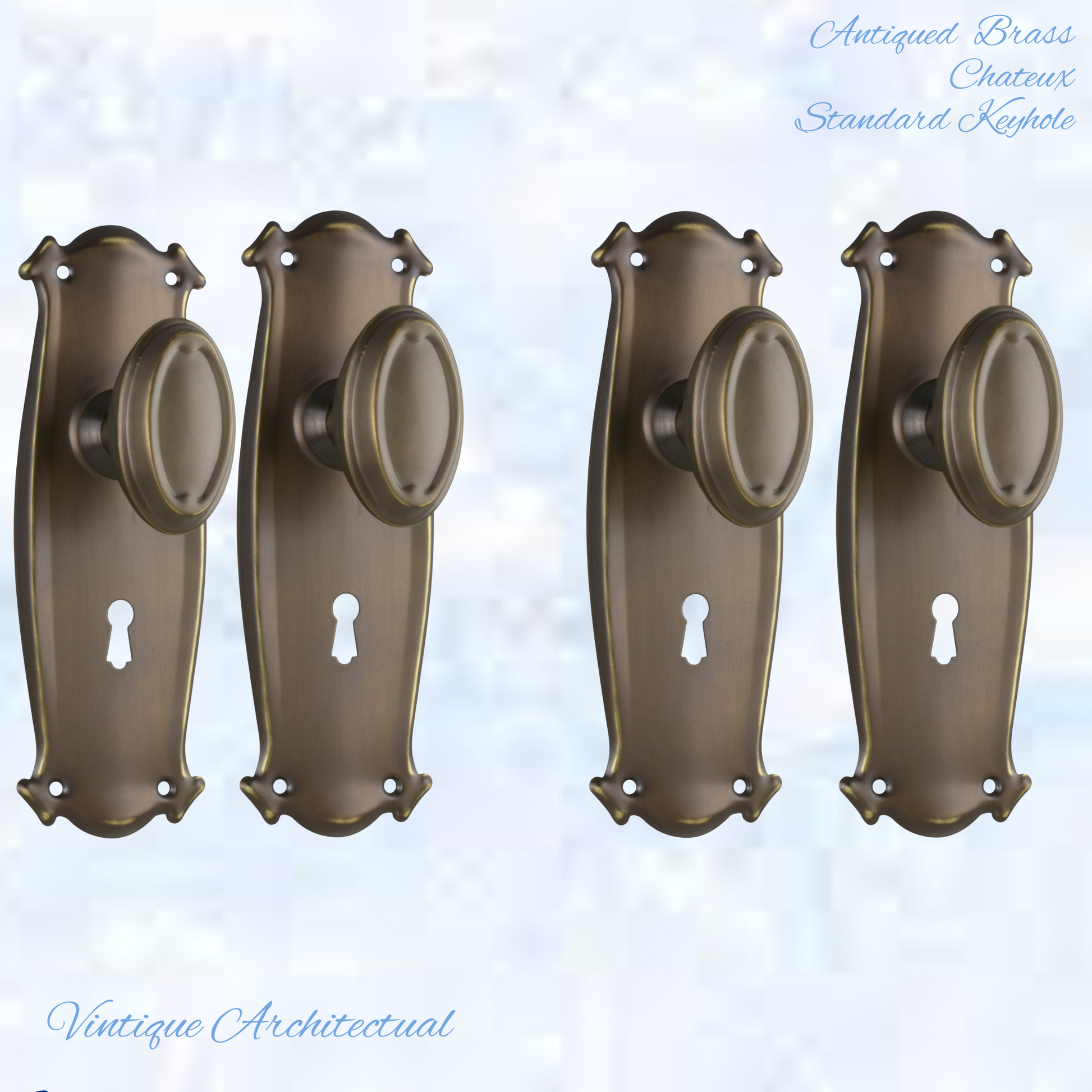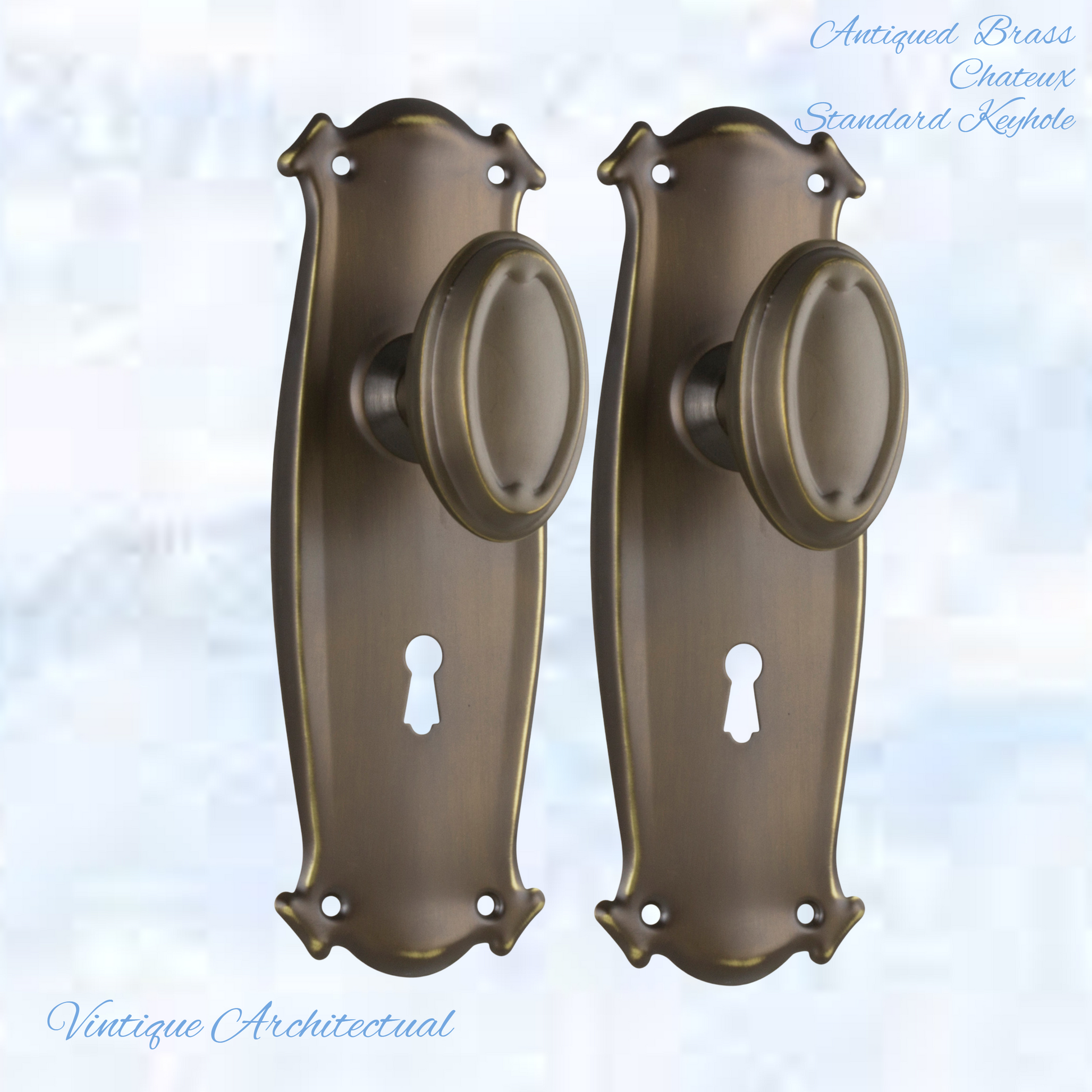 Vintique's Firenze Antiqued Brass Chateau Oval door Vintage door knob handles with a fixed backplate add a touch of Class to your home. Not only functional, strong with heavy-duty beauty for your doors.