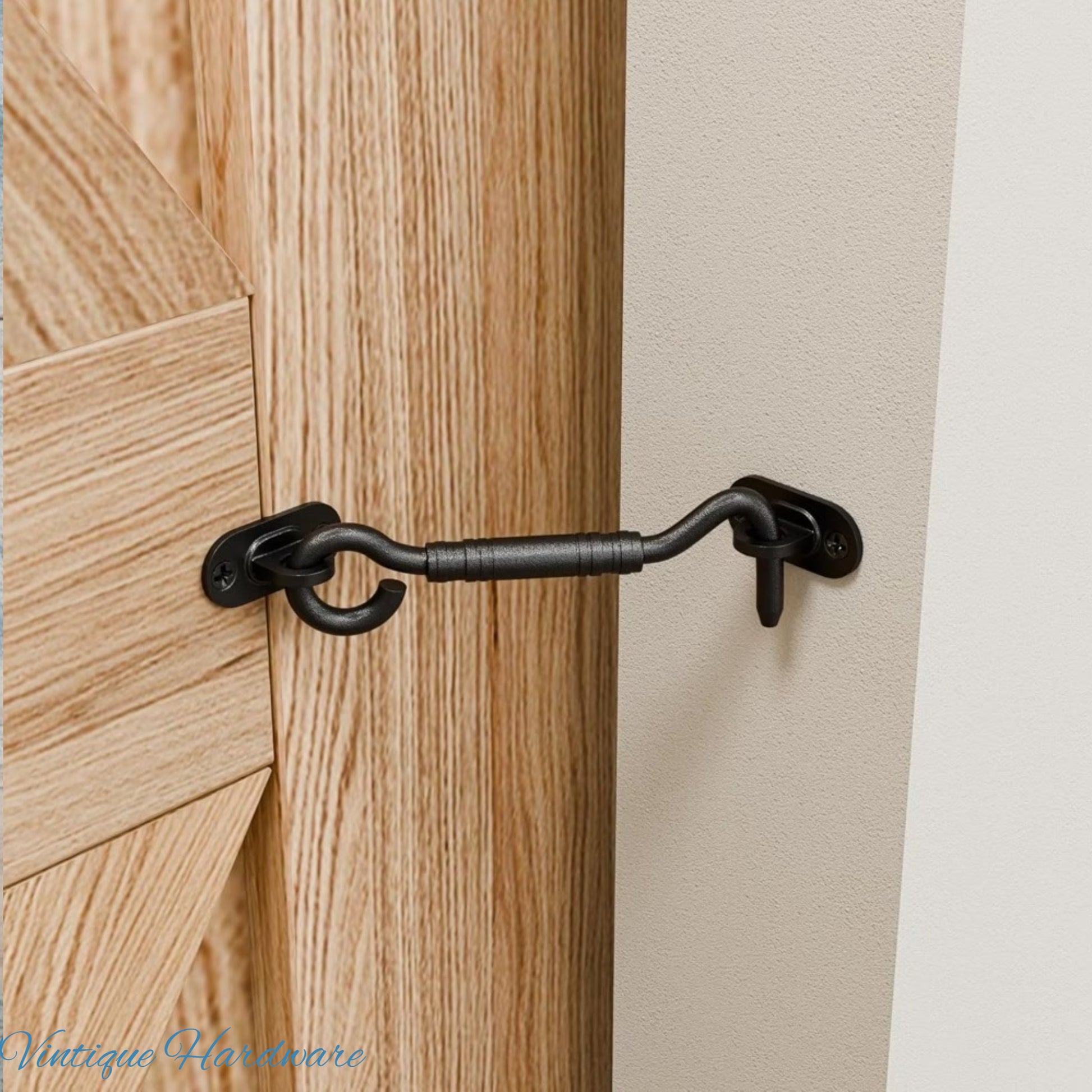 Vintique's Heavy Duty Multi-use Black Cabin hook and latch, are made from hardened steel. This sturdy Cabin Hook and eye will suit gates, windows, and more.